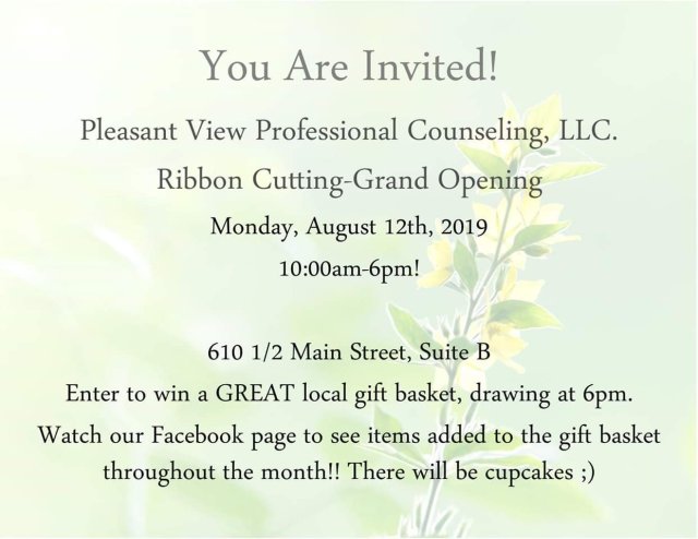Ribbon Cutting – Grand Opening August 12th. Posted bypleasantviewcounseling July 11, 2019 Leave a comment on Ribbon Cutting – Grand Opening August 12th. Share this: Share on X (Opens in new window) X Share on Facebook (Opens in new window) Facebook Like Loading... Related